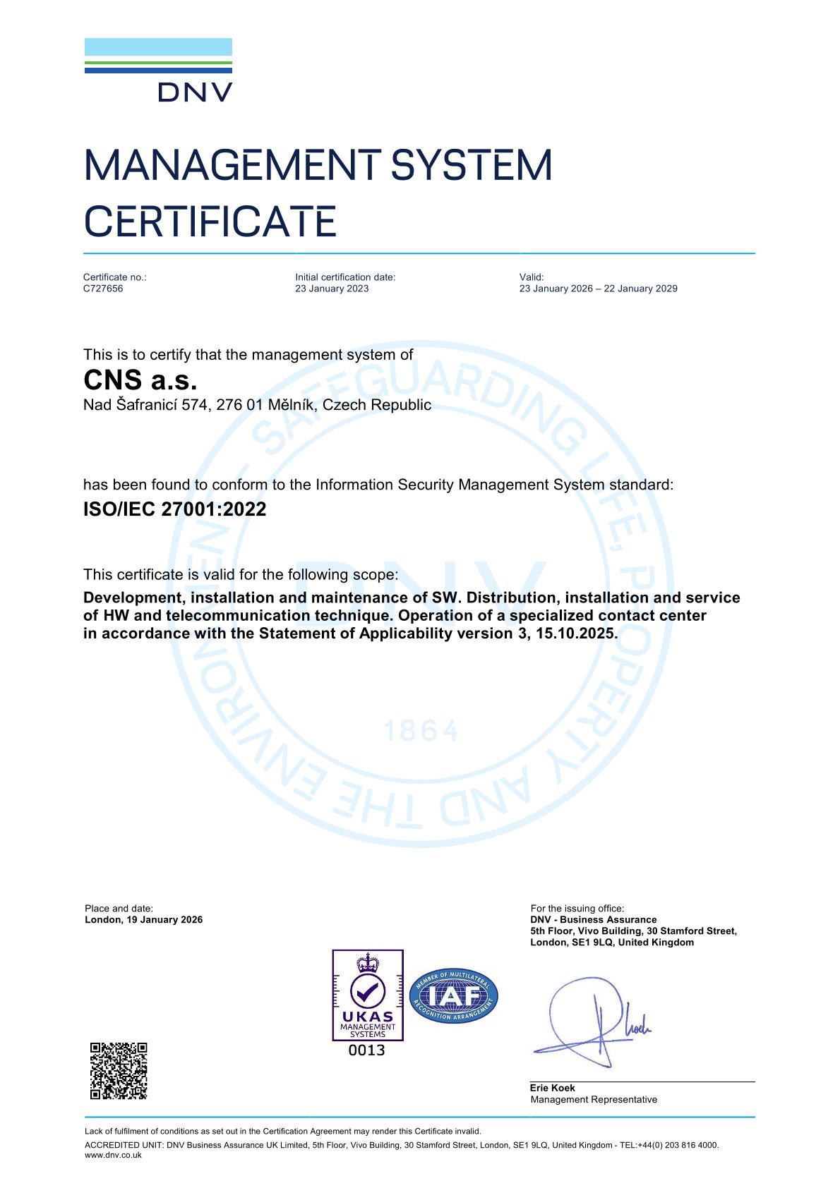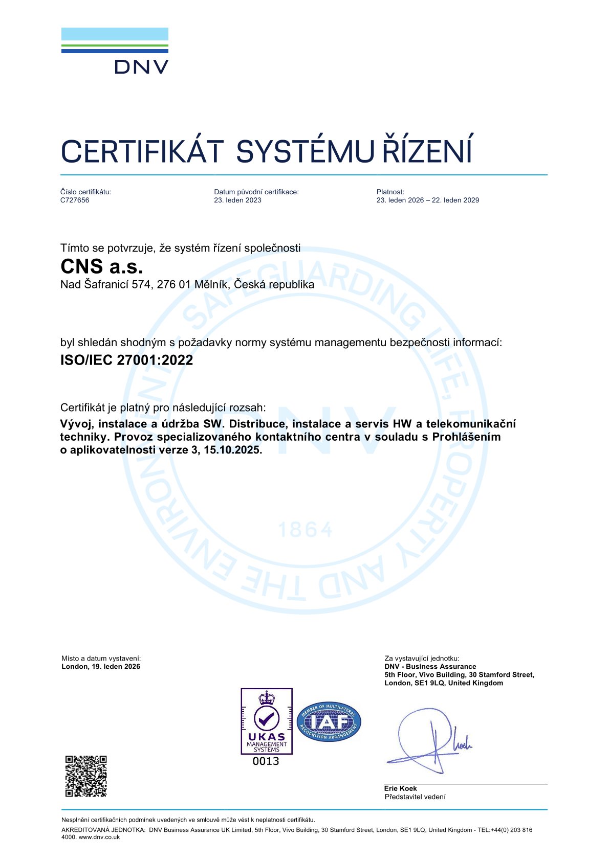 Firma CNS a.s. je držitelem mnoha certifikátů, které lze považovat za významné měřítko kvality poskytovaných služeb. Uvádíme zde vzorek vybraných certifikátů, které považujeme z hlediska prosperity naší společnosti za nejvýznamnější.